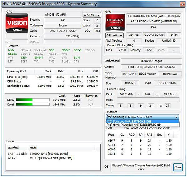 CPU: AMD Brazos E-450 1.65GHz Dual core APU (2x512KB L2 cache)